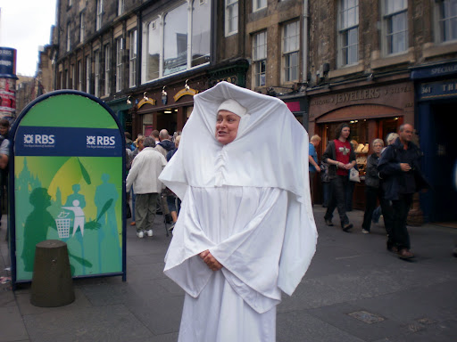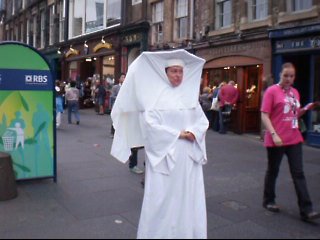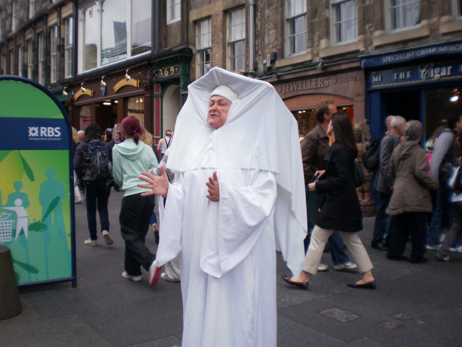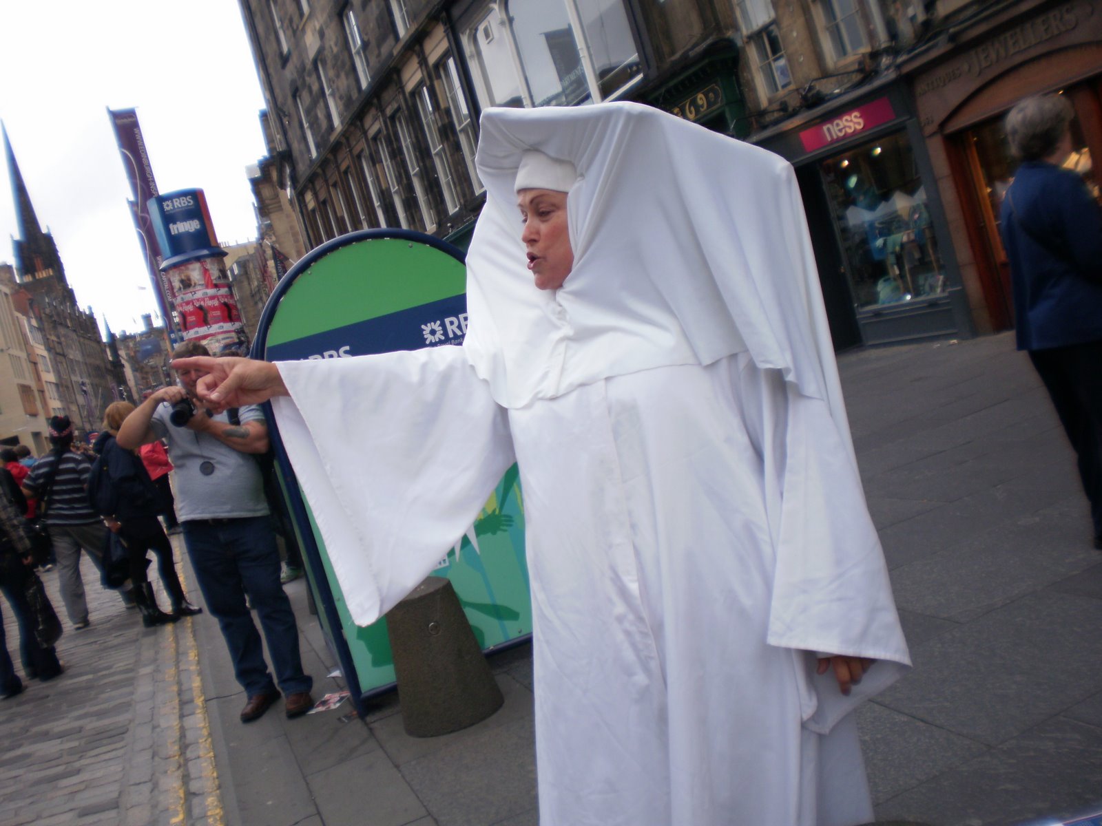 Earlier in the day I was kicked off the Royal Mile. Or rather told I must “stop performing“. It turns out that everyone who performs there, needs to pay the Fringe office 50 pounds to perform on the Royal Mile. I nearly got through my 8 minute “Nun – Two Headed Lady song” before I was stopped by official Fringe patrol, but not before I’d played to a crowd and had a big Scotsman in full kilted regalia come up and give me a pound and kiss me on the cheek when I was dressed as the Nun, all the while I was scolding him, for wearing stripes on his kilt. I felt greatly relived that I had screwed up the courage. It was too noisy to actually hear my music, (I really need an amplification system if I am planning to perform in a crowd, outdoors).