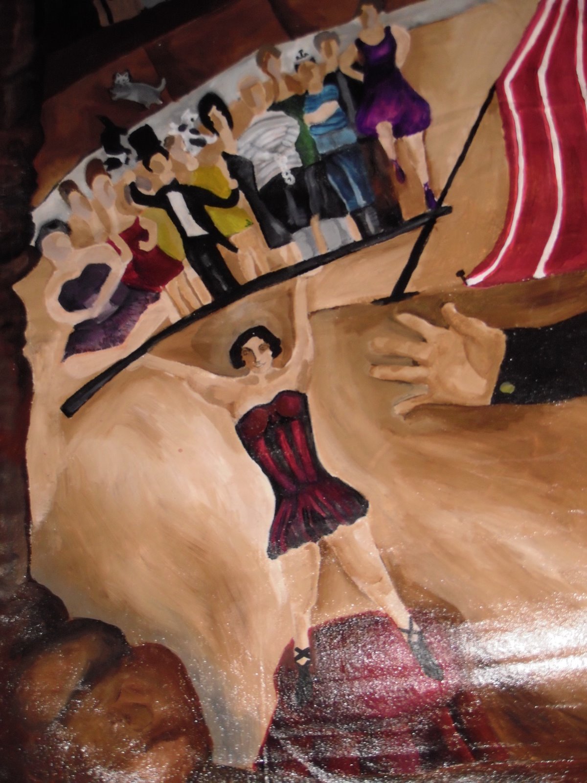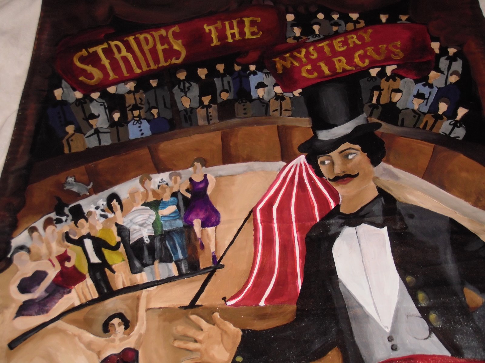 The Strong Lady is ballencing all the different circus characters atop a teeter totter, the juggler is juggling cats, the high wire act, two headed lady, the pirate all waiting for their turn to spring into action!